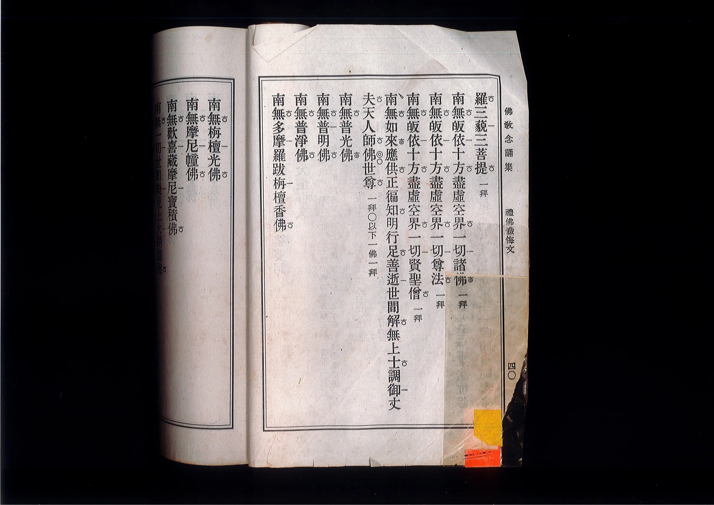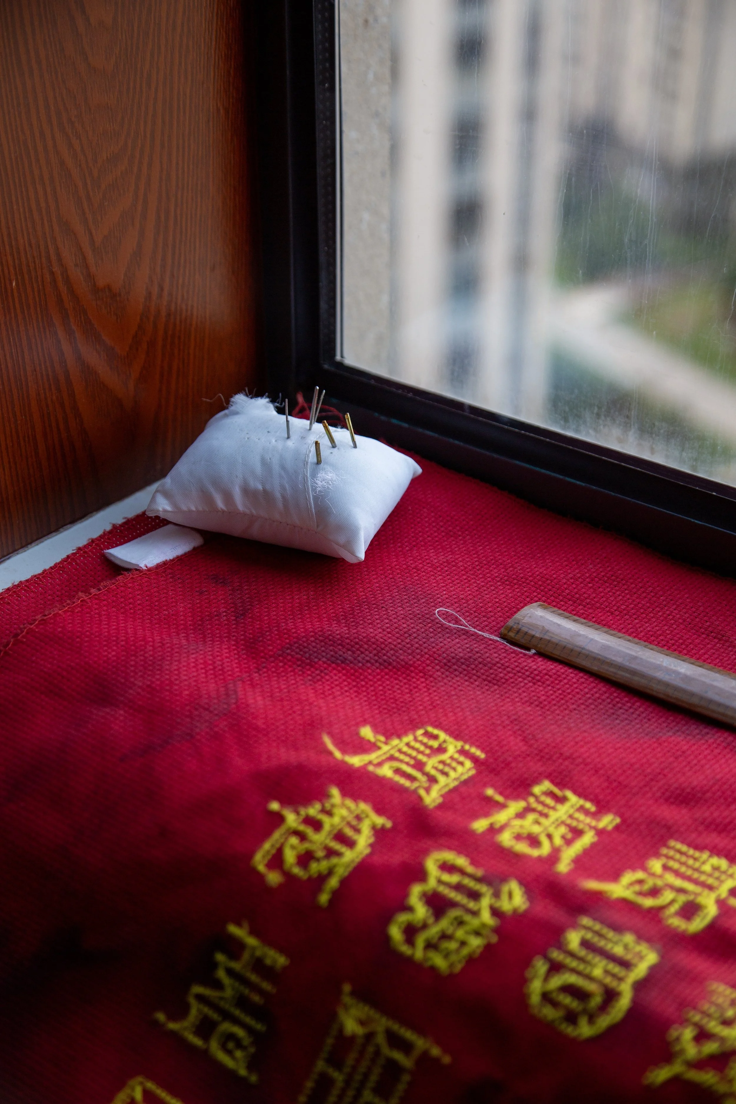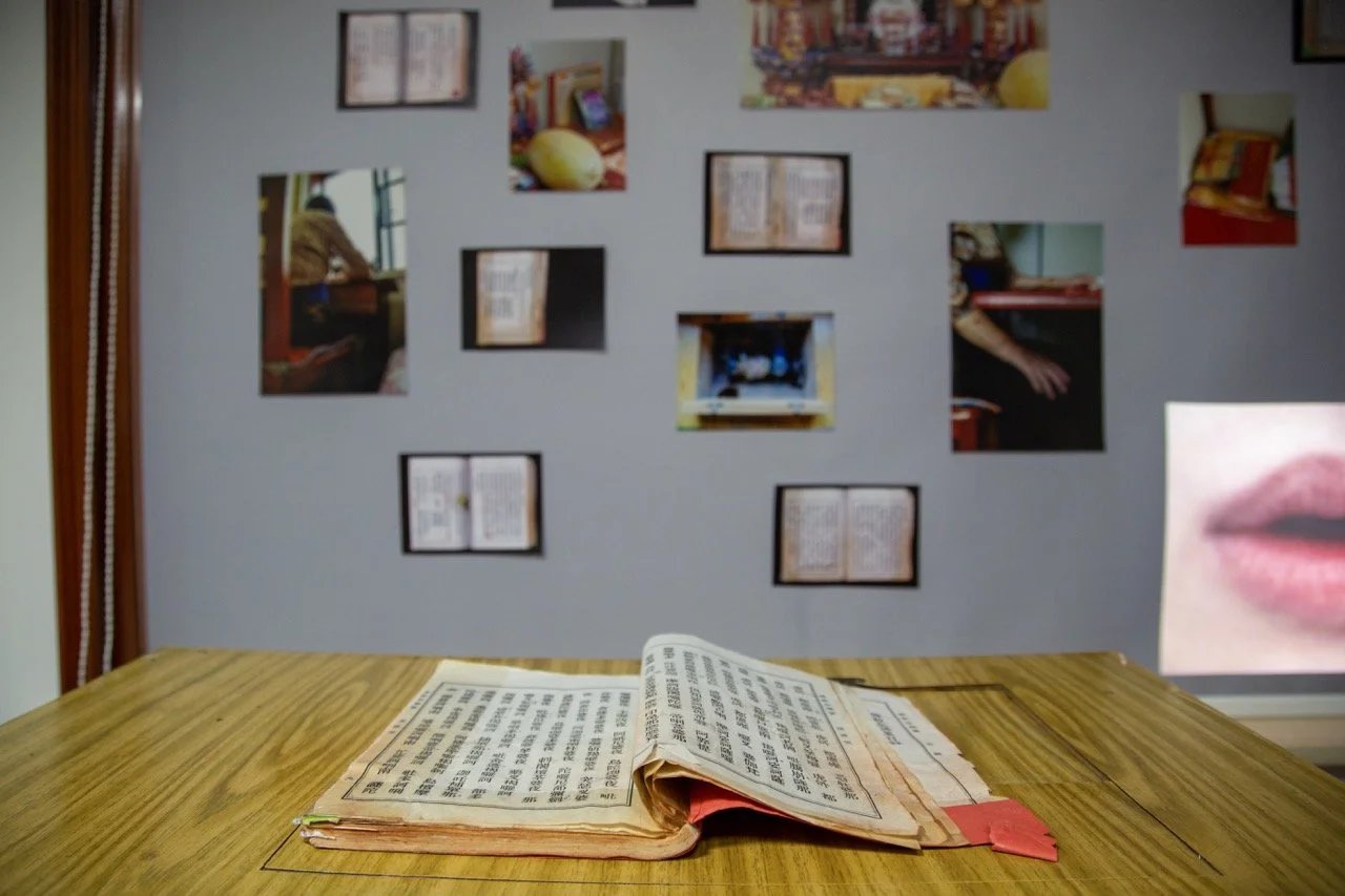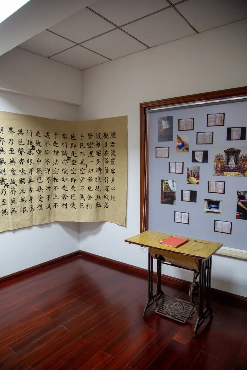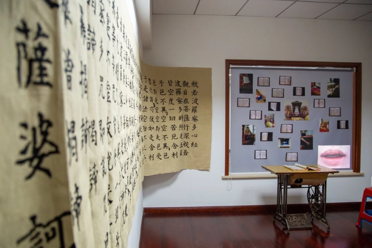 Featuring the large-scale embroidered Heart Sutra with the pronunciation of some words I did for her as a child, a video of me chanting the Heart Sutra, and a photo wall showcasing her daily life combined with scanned scriptures, along with the original sewing machine and scriptures, this piece connects spirituality and women’s labor while reclaiming undervalued domestic practices.