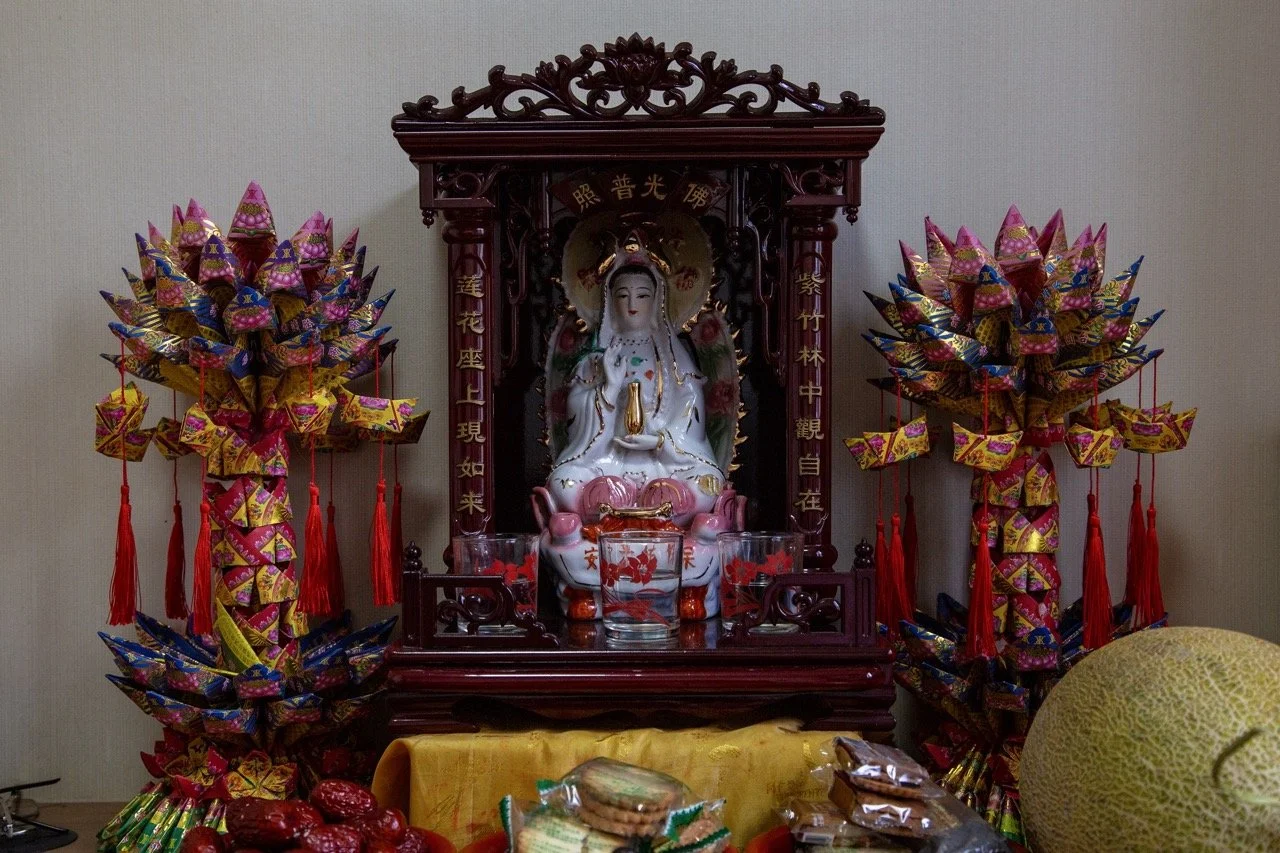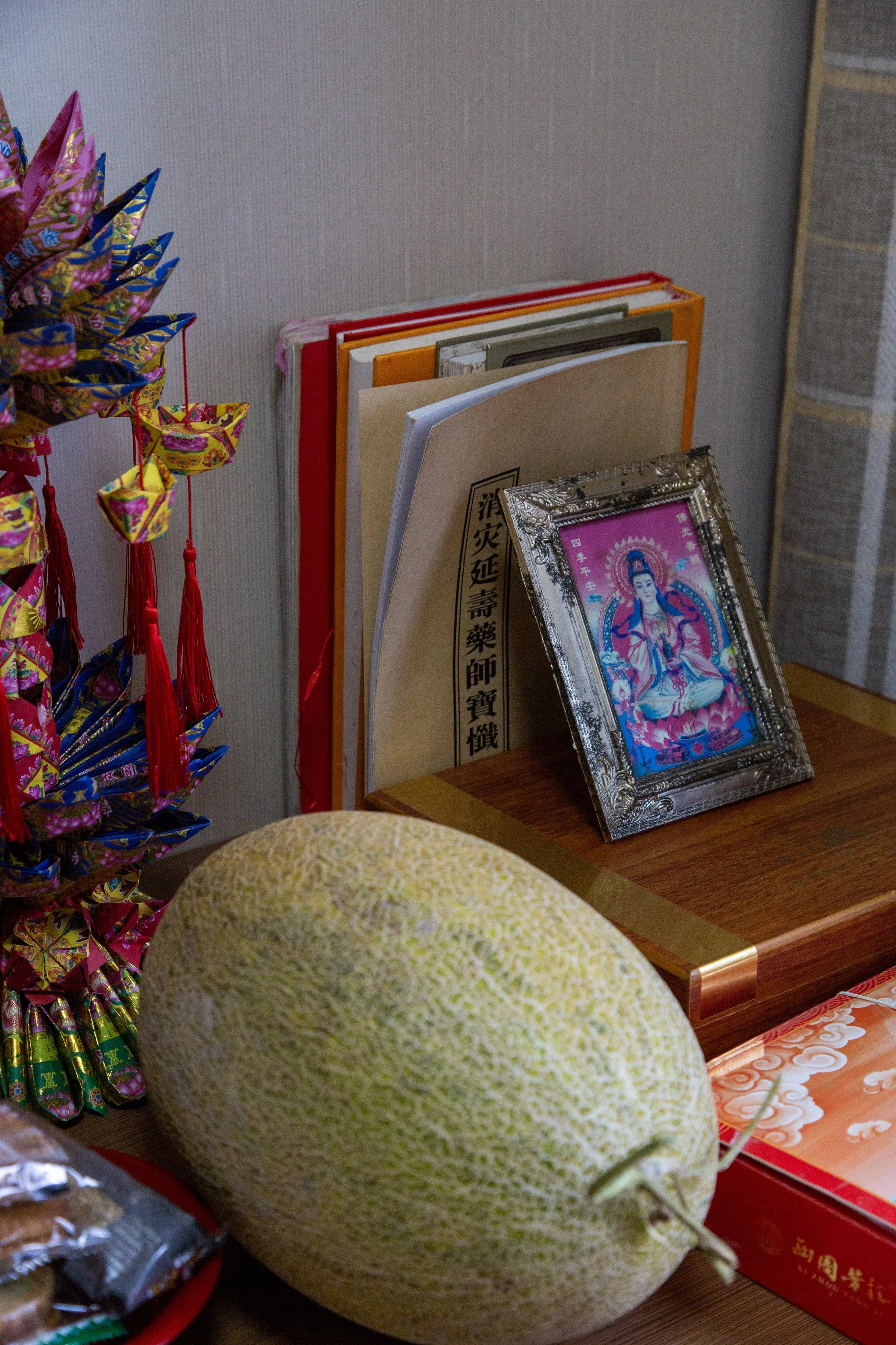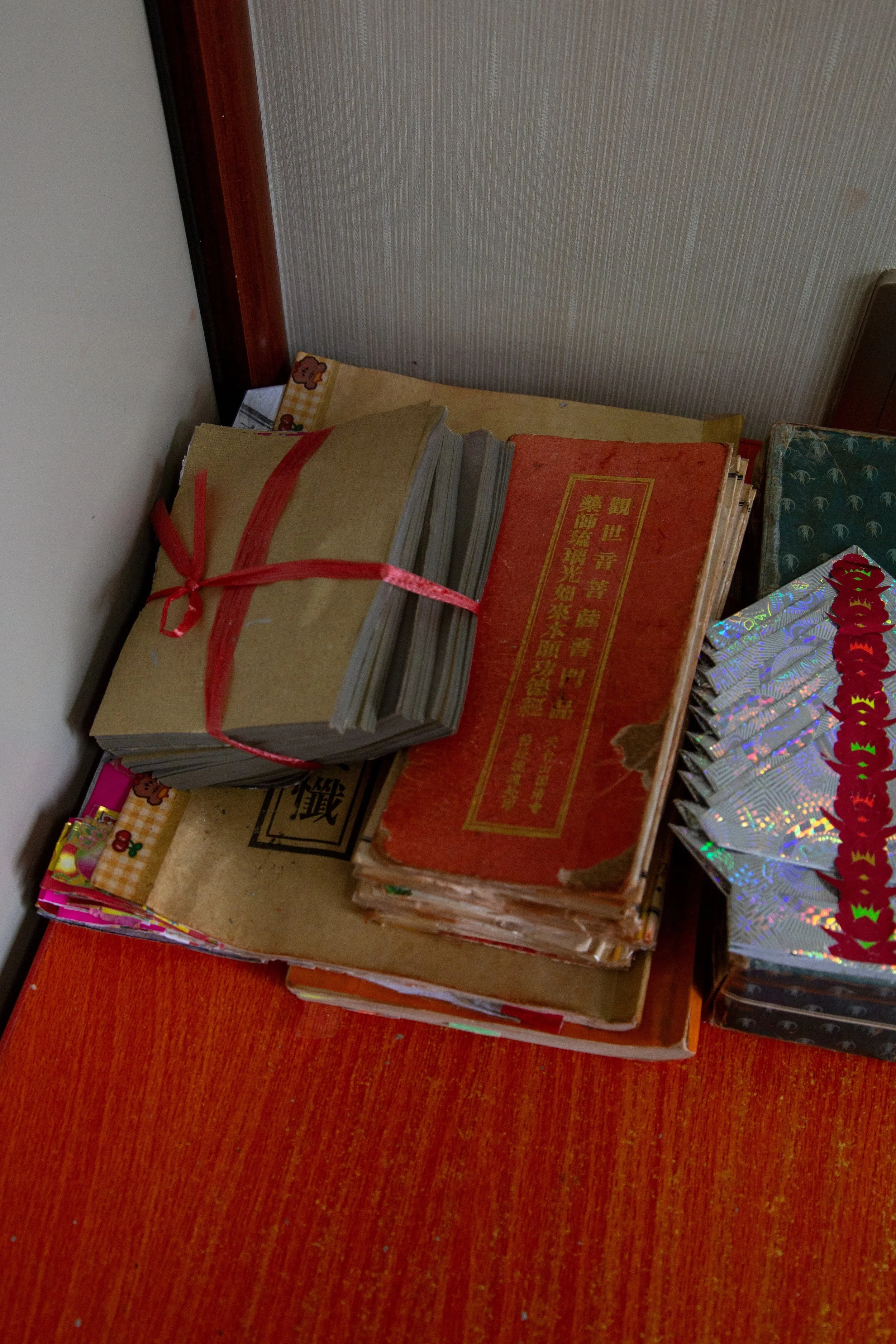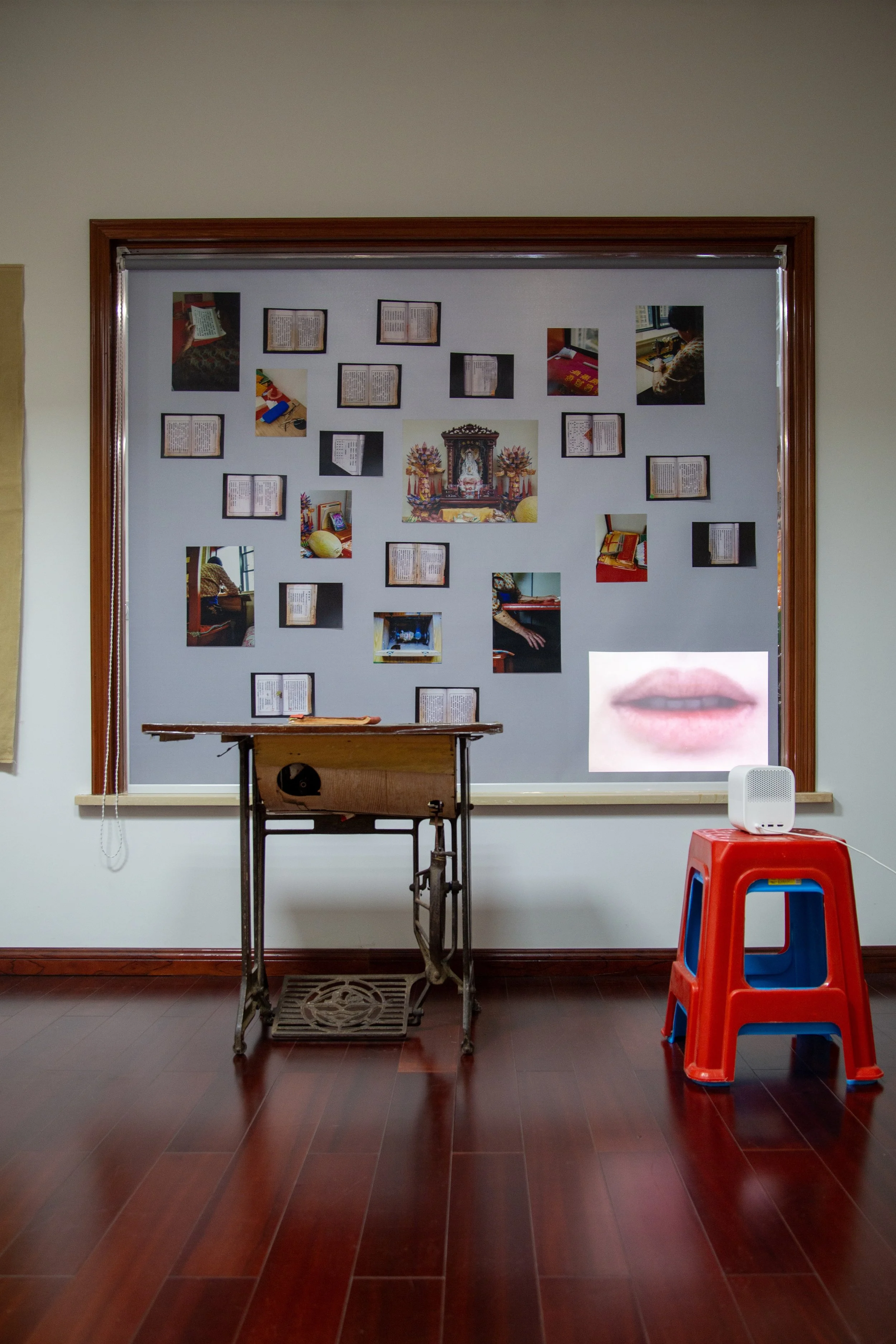 This installation about heritage was made to honor my grandma, a devoted Buddhist. At her house, she had a room that functioned as both a Buddhist hall and a space for her dowry—a sewing machine—where she spent most of her leisure time chanting and sewing.